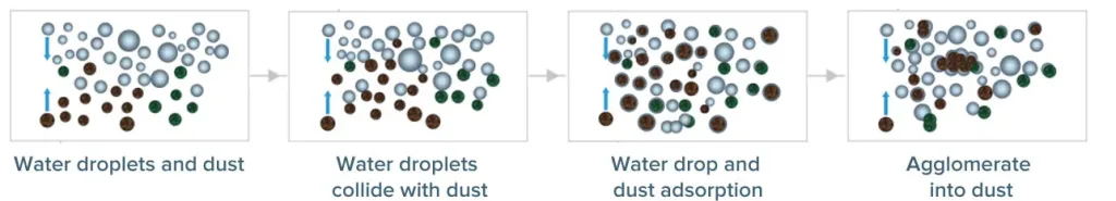 The fine water mist particles below 10μm produced by the dry mist sprayer can be used to make the dust particles stick to each other, agglomerate and increase, and settle under the action of their own gravity.